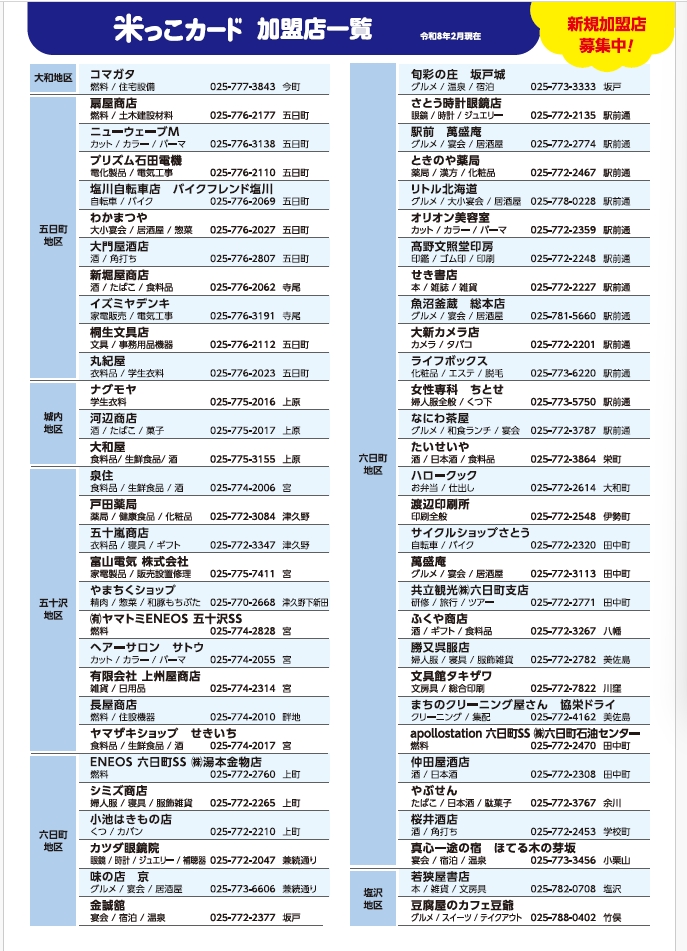南魚沼市プレミアム付商品券取扱店で、南魚沼ポイント会加盟店が対象です。